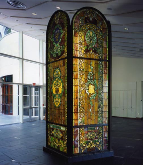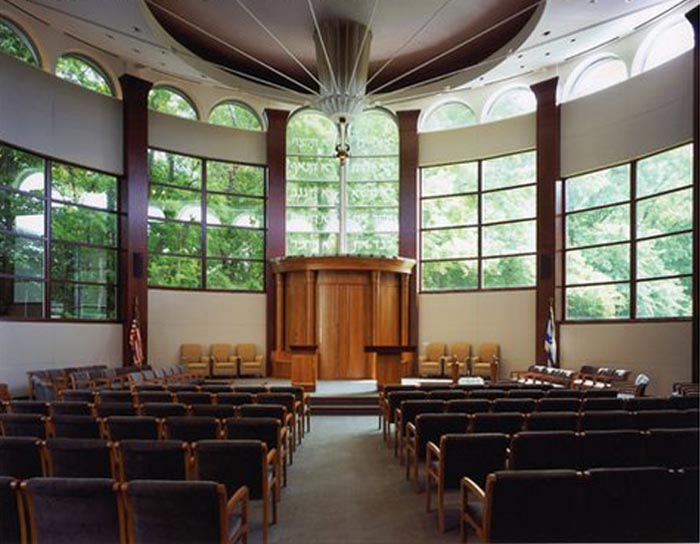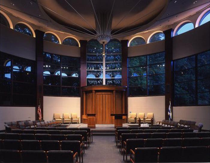 The dominant design feature of the Sanctuary is a stepped pattern of twelve pairs of windows, which progress around the drum from a low point at the entry doors, to a high point behind the Bimah. Each pair of windows is aligned under a matching pair of half-round clerestory windows above. Only at the Bimah do these vertically aligned windows actually unite to form a pair of tablets etched with the Ten Commandments, revealing the unambiguously Jewish character of the space.