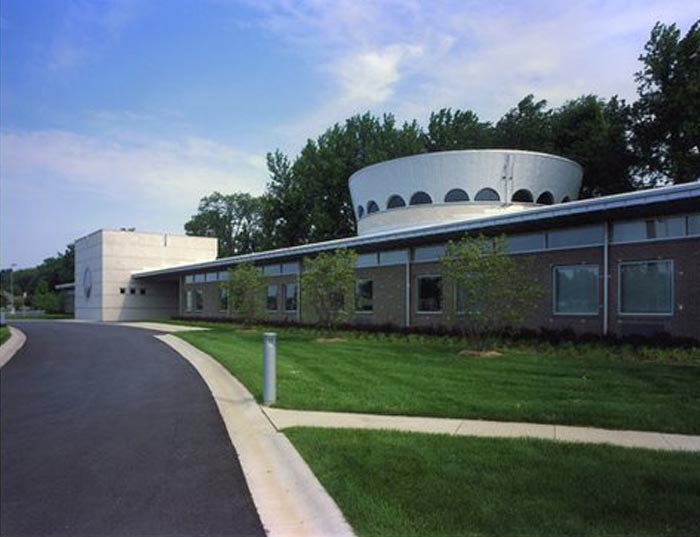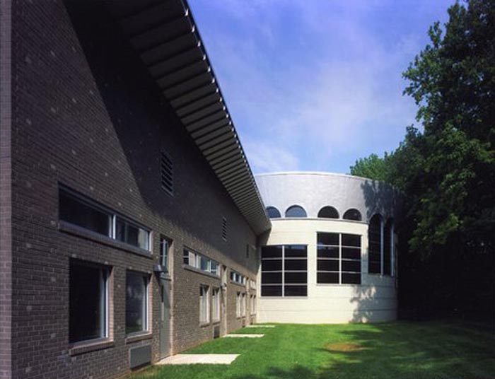 The building is an essay in balancing the particular with the universal. The use of local brick, Indiana limestone, and a standing seam roof tie the building to its specific locale in time and space, while the pure geometric forms give the structure a timeless quality. The sanctuary, in particular, expresses the purity of the axis mundi tempered by an asymmetrical exposed king post structural system which locates the center of the room over the Bimah rather than the geometric center of the circle, and supports an heirloom Ner Tamid [eternal light] which has traveled with the congregation, along with its stained glass windows, as it has moved from one home to another, growing and changing over the years yet still connecting with its history, a significant Jewish theme.