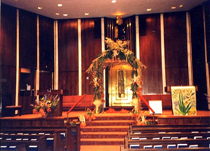 The entire eastern sanctuary wall was demolished and transformed into a translucent light infused element. A multi-leveled Bimah allowed graceful handicapped accessibility and an intimate connection to the congregation. The ceiling with its special ceiling expanding Mogen David light fixture motif, provide a strong visual bonding with the adjacent social spaces, providing a strong connection social during the High Holy Days. The new front elevation and major exposure was envisioned as an abstracted menorah and new public image, announcing the positive growth and future to all members and passersbys.